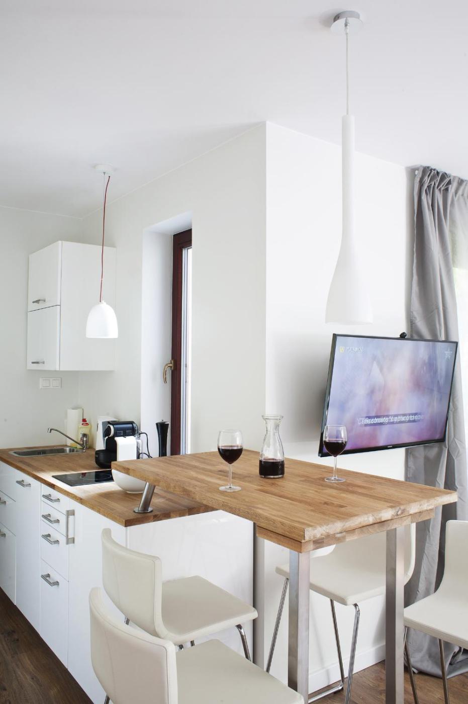 W salonie znajduje się część jadalna, sofa oraz część wypoczynkowa, a także telewizor z płaskim ekranem 📺 z kanałami kablowymi i satelitarnymi. W pokoju gościnny czeka na Ciebie gniazdko koło łóżka, rozkładana sofa oraz suszarka na ubrania.